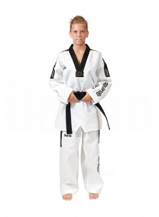 High quality fabric with star pattern. WT stripes on sleeve and leg and “DAEDO” embroidered on sleeve and leg. Taekwondo embroidery on the back. Composition: Polyester 65%, Cotton 35% Colour: White Size: 2-7